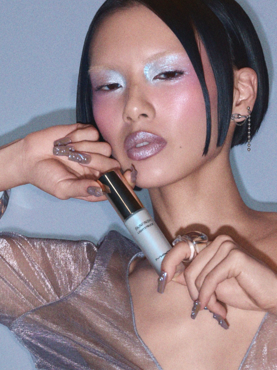 This season, we’re inspired to go full sub-zero chic with our Skinfinish Lightstruck Liquid Highlighter in Glacial, an iridescent blue shade that gives glowing skin with a frostbitten gleam. “The glitter on the eyes, the sheen, the highlight – you don’t know where one starts or ends,” says Alexandra French, Makeup Artist. And, honestly, that’s the whole vibe: a snow-kissed complexion.